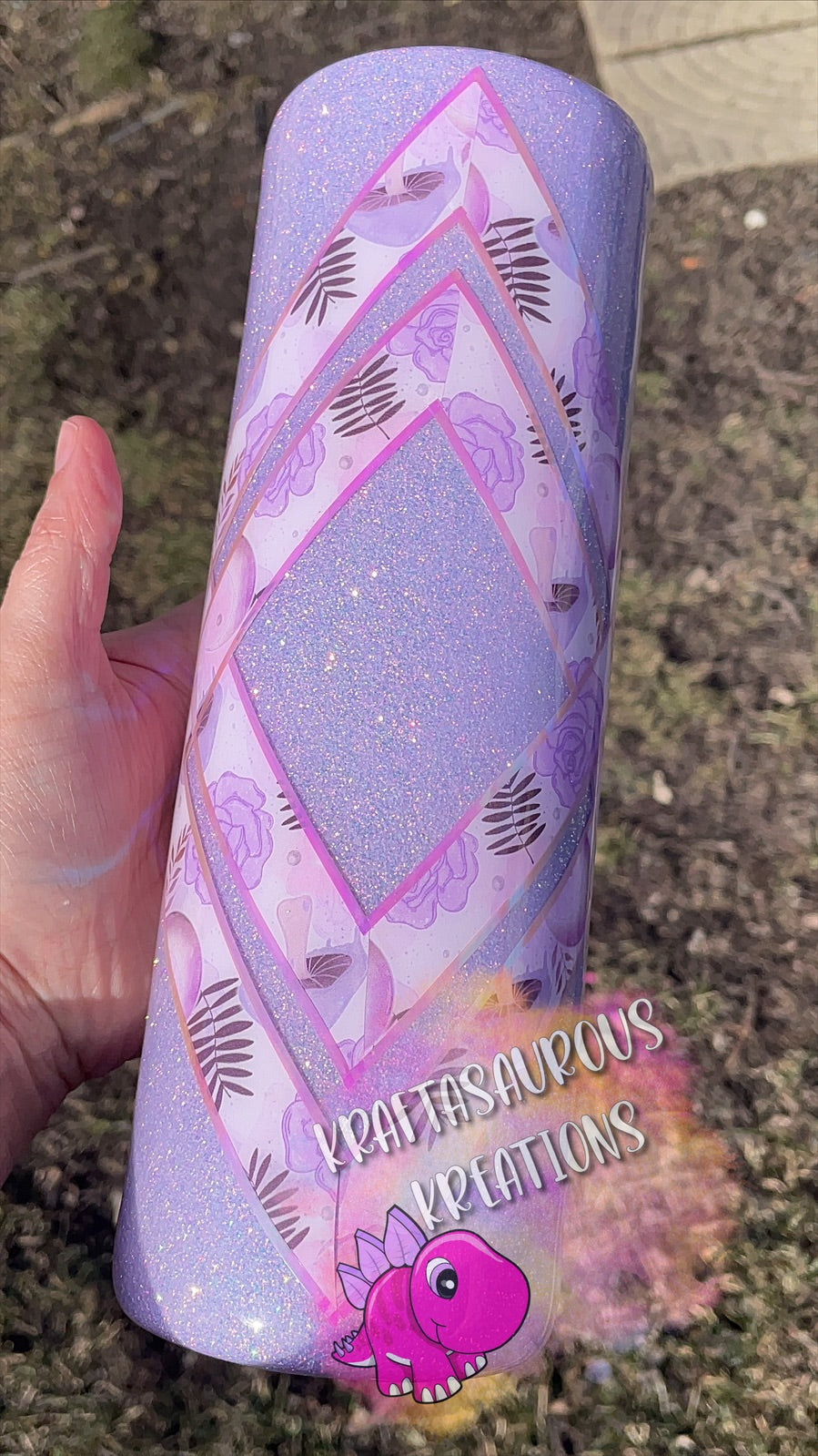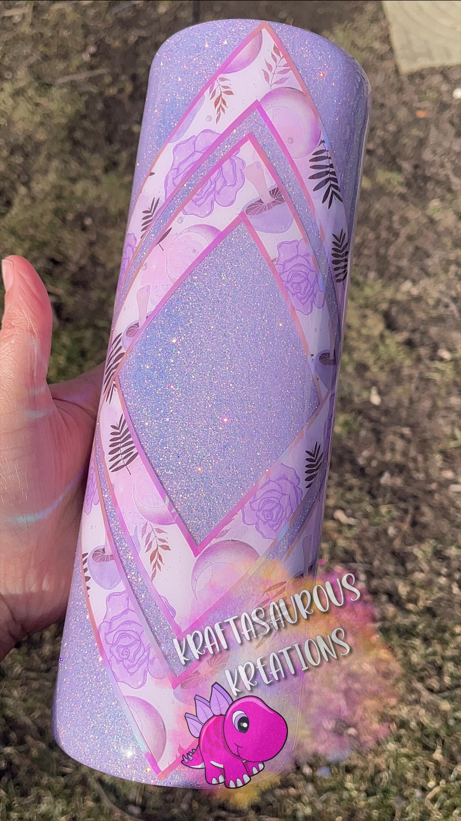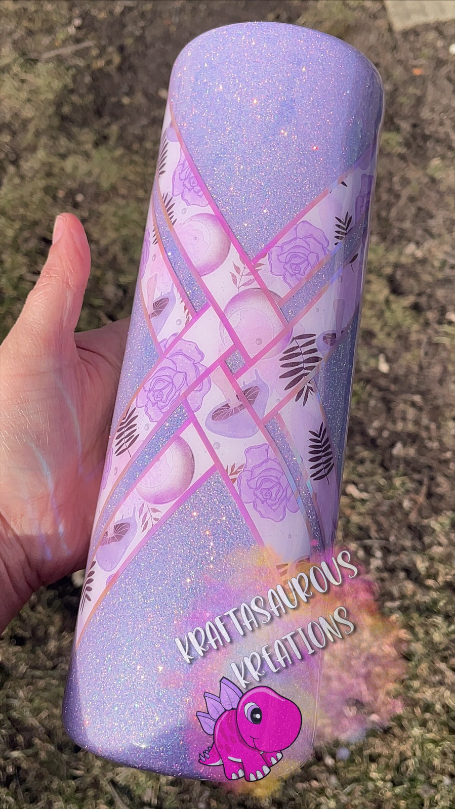 30 ounce stainless steel tumbler with purple glitter, and mushroom floral vinyl as a diamond pattern.